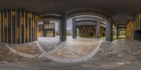 A modern urban design in Tokyo, Japan. The city's vibrant atmosphere is illuminated by artificial light. The paver surface and cobblestone walkway lead to a shopping mall with unique storefronts.