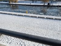 This image shows a snowy day in Berlin, Germany. A person is sitting on a bench next to a river with boats docked nearby. The urban landscape features a bridge over the river and high-rise office buildings in the background. The top-down view captures the urban design and shows the elevated road surrounded by snow-covered trees. The cloudy sky adds to the wintery atmosphere. This photo represents the urban and business district of Berlin on a snowy day.