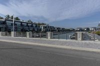 This is an image of a coastal city in Canada, specifically Toronto. The photo captures a view of a cityscape with buildings, roads, and sidewalks. In the foreground, there is a road made of asphalt with a curb and a fence along the side. The road leads towards the waterfront, where a lake or ocean can be seen. The sky is cloudy, adding to the overall urban atmosphere. This photo represents a typical day in Toronto, showcasing the city's urban design and its connection to nature.
