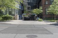 Straight down view of a classic architecture residential area in Toronto, Canada. The road surface, asphalt curbs, and tree-lined sidewalks showcase urban design. A glimpse into city life and real estate in Toronto.