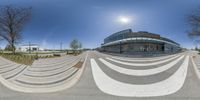 A modern architectural marvel in the heart of Toronto's business district. The sleek glass facade and straight road draw the eye towards the towering office buildings. A man with a skateboard in hand rides up the stair, adding a touch of urban energy.