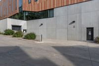 A red fire hydrant stands on the pavement in front of a large grey building in Toronto. The hard shadows on the road surface enhance the urban design of this residential area.