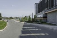 This stock photo showcases the urban design in Toronto, Canada. It features a manhole drain on the side of a street leading to a large building with multiple windows. The road surface, made of tar and asphalt, contrasts with the nearby vegetation and tree. The clear sky with clouds adds a picturesque touch to the scene. The urban environment is further emphasized by the industrial feel of the building, resembling a factory or warehouse. This image captures the essence of a bustling city day in Toronto.