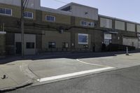 A clear sky provides the backdrop for this urban design in Toronto, Canada. The image features a low-rise residential building with a modern facade and windows overlooking the asphalt road. The property is located in a suburban neighborhood, showcasing the charm of residential areas in the city. The real estate is situated near a factory and a warehouse, making it convenient for office buildings and businesses. The street is well-maintained with tar and curbs, along with street lights illuminating the area during the day.
