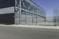 This is an image of a modern office building in Toronto, Canada. The low-rise architecture features a composite material facade and metal elements. The building is surrounded by an open space with asphalt roads and urban design. A clear sky and tints of shade create a contrast with the hard shadows cast by the building. The image captures the urban atmosphere of Toronto, showcasing its modern architecture and suburban surroundings. This photo represents a typical day in the city, highlighting the combination of residential and commercial buildings.