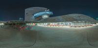 A fisheye view of an empty public transportation hub in Dallas. The modern architecture and straight road lines create a striking urban design. The city street is illuminated by artificial light, giving a dark and mysterious atmosphere.