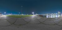 A panoramic view of the cityscape of Holland, Netherlands. The image captures the vibrant city life illuminated by streetlights at night. The walkway guides pedestrians along the waterfront, creating a picturesque scene. The high-rise buildings and skyscrapers stand tall against the clear night sky.