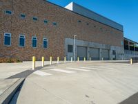 This is an image of a modern office building with a brick facade in a busy city. The clear sky above contrasts with the concrete street and asphalt road surface. In front of the building, yellow poles mark the loading dock area. This photo represents the urban architecture and business district of a bustling city. The brick building stands tall in the residential area, showcasing the modern design and real estate opportunities. With its sleek and clean lines, this building is a great example of urban design and modern architecture.