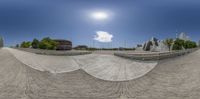 a fisheye lens reflects a skateboarder on the side of the ramp as another skateboarder stands in the distance