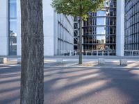 A modern architectural marvel in the heart of Berlin, Germany. The city's vibrant streets lined with trees create a dynamic urban atmosphere. The tree growing between the buildings adds a touch of nature to the bustling cityscape.