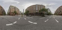 Urban scene in Hamburg, Germany. Modern residential architecture casting hard shadows on classic brick walls. Clouds hover over the city, creating a dynamic skyline. A typical day in European urban design.