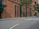 Urban scene in Hamburg, Germany. Classic brick wall houses with modern architecture. Hard shadows cast on the asphalt road. Clouds drift over European cityscape. A blend of classic and modern urban design.