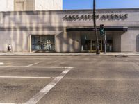 the sidewalk outside a business with parking spaces and an exit sign for traffic is visible in the foreground
