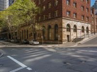 A city scene on a clear day, showcasing urban infrastructure and residential areas. Office buildings and brownstone homes line the streets. Busy roads with automobiles and pedestrians add to the vibrant city life.