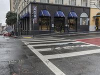 This is an image of a classic architecture building in San Francisco, with a road and crosswalk in front of it. The wet road surface reflects the daylight, creating a shimmering effect. Pedestrians are seen crossing the road at the zebra crossing, while others are dining at the restaurant and bar on the corner. The urban infrastructure and curbs add to the cityscape. This photo captures the atmosphere of a bustling and vibrant day in San Francisco.
