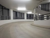 This is an image of a modern architectural structure in Berlin, Germany. The cityscape at night showcases the sleek and well-designed building made of concrete and glass. The interior features a well-lit and spacious hallway with wood flooring and a curved handrail. The artificial light enhances the modern and urban feel of the space. The image also includes a view of a parking lot with concrete streets and levels. This photo represents the combination of modern architecture and urban design in the city of Berlin, Europe.