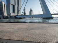 This is an image of a modern cityscape in Holland, Netherlands. In the foreground, there is a high-rise building with a clear sky as the backdrop. A long cable-stayed bridge spans over a river, adding to the urban architectural design. The cobblestone surface provides a unique touch to the city. This photo captures the essence of city life in Europe, with a combination of modern architecture and historic elements. The dawn light creates a beautiful atmosphere, highlighting the beauty of the city.