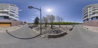 A fisheye view of a road in Bremen, Germany, surrounded by modern architecture. Clear sky contrasts with the urban landscape. Residential area features brick walls and high-rise buildings. A symmetrical and vibrant city scene.