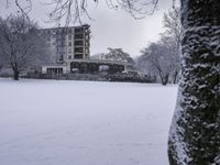 This image showcases a snow-covered park in wintertime, with a tree and building in the background. The atmosphere is calm, with clouds scattered across the sky. A serene landscape that captures the beauty of winter. The snow-covered branches of the tree add to the overall picturesque scene. This photo represents the peacefulness and tranquility that can be found in winter landscapes.