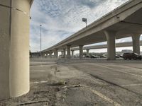 A cityscape of Chicago, Illinois, showcasing its iconic architecture and urban infrastructure. The road surface leads to an underpass and concrete bridge over water. A parking deck and industrial factory are visible in the open space. Contrails trace the sky above.