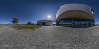 A modern architectural marvel in Lisbon, Portugal. The circle of clear sky frames the building, creating a stunning urban landscape. The sun shines brightly, casting hard shadows on the empty circle, embodying the vibrant city life.