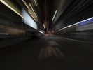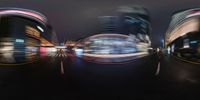 A nighttime view of an intersection in New York City. The straight road, lined with buildings, creates a symmetrical urban landscape. Light streaks on the building tops add a sense of motion. The blue and red lights create a graphic and technological ambiance.