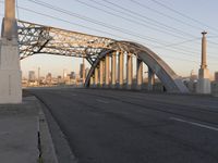 This image captures the beautiful cityscape of Los Angeles, California, USA at dawn. The city is dotted with tall buildings and a stunning skyline. In the foreground, a bridge spans over a highway, adding to the urban structure of the city. The bridge is made of concrete and is an example of an extradosed bridge. The lanes of the highway are made of asphalt. This photo showcases the dynamic and vibrant city of Los Angeles at the start of a new day.