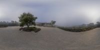 A foggy morning in Los Angeles, California. Blurry trees on a hilltop create a gloomy atmosphere. A skateboard ramp in the foreground adds to the urban landscape. Modern architecture and residential areas blend seamlessly in this suburban neighborhood.