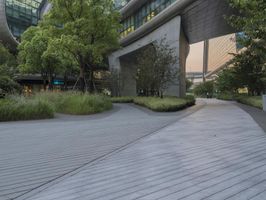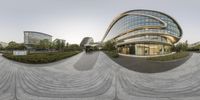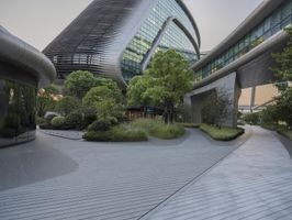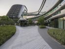 A futuristic architectural masterpiece in Shanghai's bustling Soho district. The curved path leads through a vibrant urban landscape, with a mix of residential and commercial buildings. The clear sky provides a stunning backdrop for this metropolitan scene.