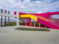 a colorful basketball court with a big stairwell on one floor and yellow railings on the other side