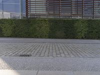an image of an empty bench on the sidewalk near bushes and streetlights on a sunny day