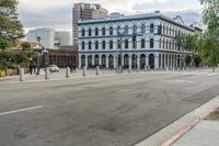 This is an image of a classic architectural hotel in the city of Los Angeles, California, USA. The low angle shot captures the grandeur of the building against the clear sky at dawn. The road leading up to the hotel is made of smooth asphalt, reflecting the urban setting. This photo showcases the timeless beauty of the city's classic architecture and highlights the vibrant atmosphere of Los Angeles.