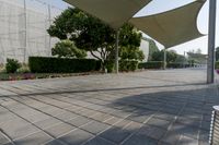 This is an image of a modern cityscape in Abu Dhabi, United Arab Emirates. The photo captures the architectural structures of the city, including the roads, walkways, and buildings. The clear sky above provides a contrast to the concrete surfaces and asphalt roads. The residential areas can be seen with their distinct walls, floors, and roofs. The image showcases the urban landscape and the public spaces, with trees providing shade along the curbs. This photo represents a typical day in Abu Dhabi, highlighting the real estate and infrastructure of the city.