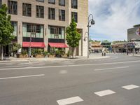 This is an image of a modern architecture building in the city of Berlin, Germany. The mixed-use property is located in a vibrant residential area, surrounded by other buildings and trees. The road in front of the building is made of asphalt and is lined with trees. In the foreground, there is a lane with a red car parked on it. The urban setting reflects the lively atmosphere of Berlin, with its numerous hotels, restaurants, and tourist attractions. This photo captures a typical day in Berlin, showcasing its unique architecture and bustling city life.