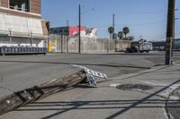 A view of a classic architecture building in Los Angeles, California. The building is surrounded by a graffiti wall in an art district. The clear sky contrasts with the vibrant city life below. A suburban residential area can be seen in the distance.