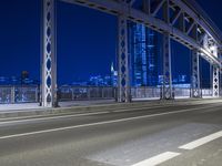 This is an image of a cityscape at night in Frankfurt, Germany. The metropolitan area is illuminated by the vibrant lights of the city, creating a stunning skyline. The architecture includes bridges and roadways, with a prominent highway and lanes. The blue skyway adds a modern touch to the urban landscape. Street lights shine brightly, adding to the overall brightness of the city. This photo captures the dynamic and bustling atmosphere of Frankfurt at night.