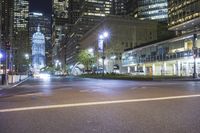 Nighttime in New York City, where street lights illuminate the modern architecture of Manhattan. A bustling metropolis with empty intersections and a vibrant city skyline.