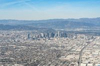 This is an aerial view of the metropolitan area of Los Angeles, California, USA. The photo showcases the modern architecture of the city against a clear sky. Tall buildings and skyscrapers create a stunning cityscape and skyline. The vibrant urban environment is surrounded by trees and green spaces. This image captures the bustling energy and modernity of Los Angeles, an iconic city in the United States.