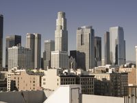 This is an image of the Los Angeles skyline in California, USA. The cityscape showcases the urban metropolis with its high-rise buildings and skyscrapers. The clear sky above highlights the architectural marvels and open spaces found in the city. The viewpoint overlooks a parking deck, providing a unique perspective of the metropolitan area. This photo represents a typical day in Los Angeles, capturing the bustling atmosphere and the dynamic energy of the city.