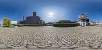 A panoramic shot of classic architecture in Berlin's cityscape. Buildings line the sidewalk of a bustling urban neighborhood. Clear skies highlight the city's modern and historic architecture. A vibrant and lively open space in the heart of Europe.