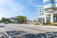An empty city street in downtown Milwaukee, Wisconsin. Modern architecture stands tall, surrounded by a bustling urban neighborhood. Cars and pedestrians fill the roads, adding life and movement to this vibrant residential area.