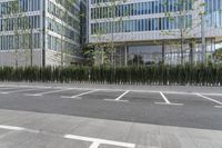This stock photo features a modern architecture urban office building in the bustling business district of Shanghai, China. The image showcases a well-maintained sidewalk adorned with trees and shrubs, surrounded by lush green grass. In the foreground, there is a spacious parking lot, ideal for city life convenience. The high-rise building stands tall and imposing, reflecting the vibrant metropolitan area of Shanghai. The mix of grey asphalt road and tar lane adds to the urban design and infrastructure of the surroundings. This image captures the essence of city living and the dynamic business atmosphere of Shanghai business district.