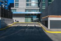 A modern office building in the heart of Toronto's business district. The tall building shines in the daylight, casting long shadows on the urban landscape. Concrete curbs line the walkway, leading to the impressive entrance.