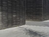 This is an image of a modern architecture building in Germany. The city street below is made of asphalt, while the building facade is made of composite materials and wood. The open space in front of the building features a grey wood flooring. The urban design incorporates shade from trees and a wooden wall with a grille pattern. The image showcases the combination of modern and natural elements in the urban landscape of Germany. With its unique architectural features and urban design, this photo represents the contemporary charm of European cities.