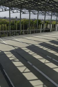 the roof is made from metal bars, and it has shadows on the floor as if of a rail way
