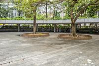 This stock photo captures an urban park in the city, featuring architectural structures. The scene showcases a mix of elements such as roads, walkways, and open spaces integrated with greenery. The well-maintained asphalt roads and concrete walkways lead through the park, surrounded by lush grass, trees, and various vegetation. The urban park also offers several benches and a courtyard for relaxation. With its blend of real estate, public spaces, and recreational areas, this city park is an ideal place for residents and visitors to unwind and enjoy the vibrant town atmosphere.