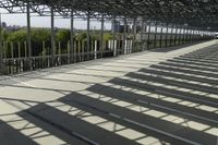 In the heart of Toronto, Canada, this image showcases the modern urban design and open spaces of the city. The clear sky overhead highlights the elevated concrete surface of a parking deck, providing a symmetrical and parallel view. The man walking down the steps towards the sky gives a sense of movement and energy. Surrounding the area are warehouses and fenced-off rectangles of grass and wood, adding to the composite material composition. This photo captures a typical day in Toronto, with its high-rise buildings and well-designed urban landscape.