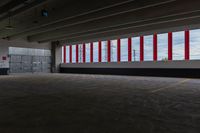This image captures the urban atmosphere of Toronto, Canada. The photo shows the empty parking garage of a warehouse, with red and white striped stripes on the surface. The city skyline towers in the background, highlighting the urban design of Toronto. The clear blue sky and fluffy white clouds add a touch of serenity to the bustling city scene. This photo represents the city life of Toronto, showcasing the unique architecture and urban infrastructure that defines the city.