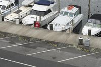 Aerial view of a busy urban parking lot with cars parked on asphalt. High-rise buildings surround the area, showcasing the city's infrastructure. A boat can be seen on the nearby waterway, adding a touch of naval architecture to the scene.