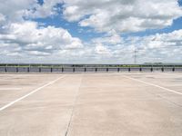 This stock photo features a wide expanse of parking spaces on top of a modern architecture building in Berlin, Germany. The cityscape is characterized by straight roads, concrete streets, and architectural fixtures, creating a symmetrical and engineered landscape. The parking deck overlooks an open space with neatly trimmed grass and a bridge on the horizon. The cloudy blue sky with cumulus clouds adds depth to the composition. This urban scene showcases the city's architectural and engineering prowess, providing ample parking space in a well-planned concrete structure.